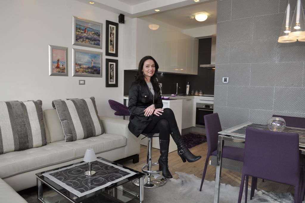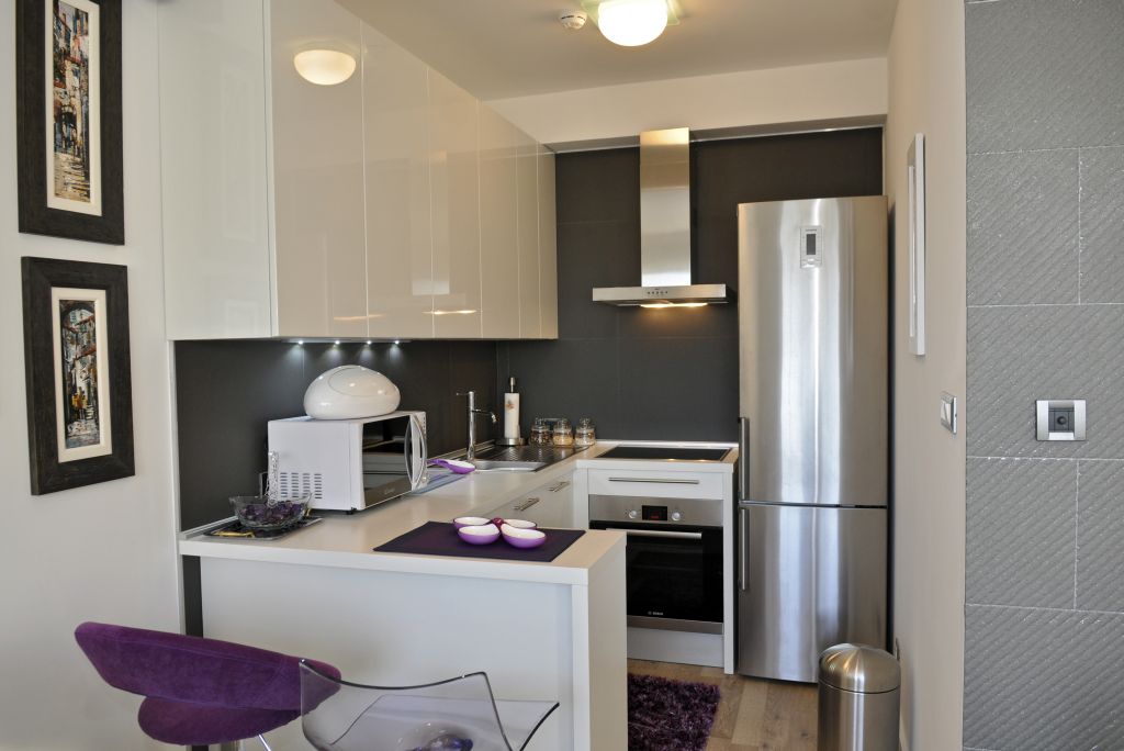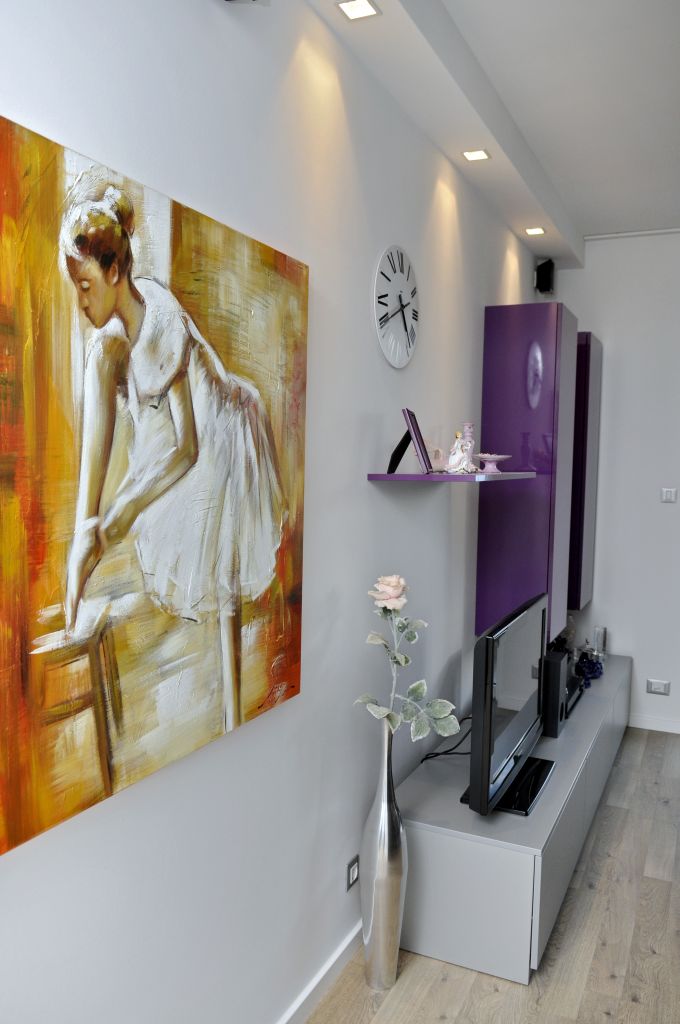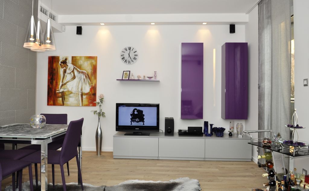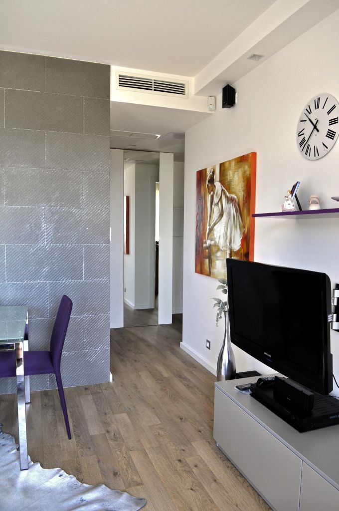 The flat is compact layout, divided into three thematic sections: the entrance area with wardrobe, then the living room with dining room and kitchen in a free, fluid open plan, and sleeping tract.